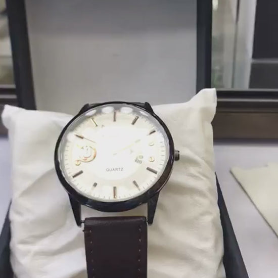 Available in two classic variants—Black Strap with Black Dial and Brown Strap with White Dial—each watch is crafted for comfort, durability, and effortless fashion. The premium leather strap ensures a secure fit, while quartz movement guarantees precise timekeeping. Water-resistant design protects against everyday splashes, making it perfect for casual or formal wear.